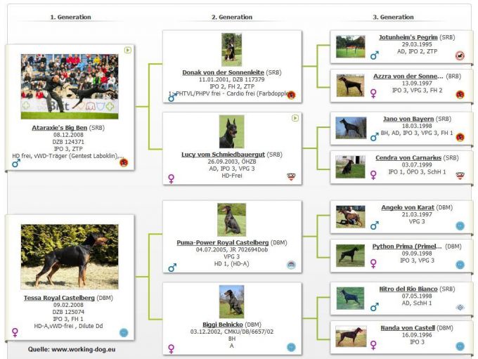 Binja ist eine mittelgroße und sportlich gebaute Hündin mit vorbildlichem Gangwerk. Sie hat ein dichtes, derbes Fell mit sehr guter Farbe und Brand. Ihre Triebanlagen liegen im mittleren Bereich, was im Alltagsleben sehr angenehm ist. Binja ist kinderfreundlich und sozial verträglich. Sie hat eine sehr gute Fährtenanlage und lässt sich in der Unterordnung problemlos mit Ball und Futter ausbilden. Gesundheitlich ist Binja sehr robust.